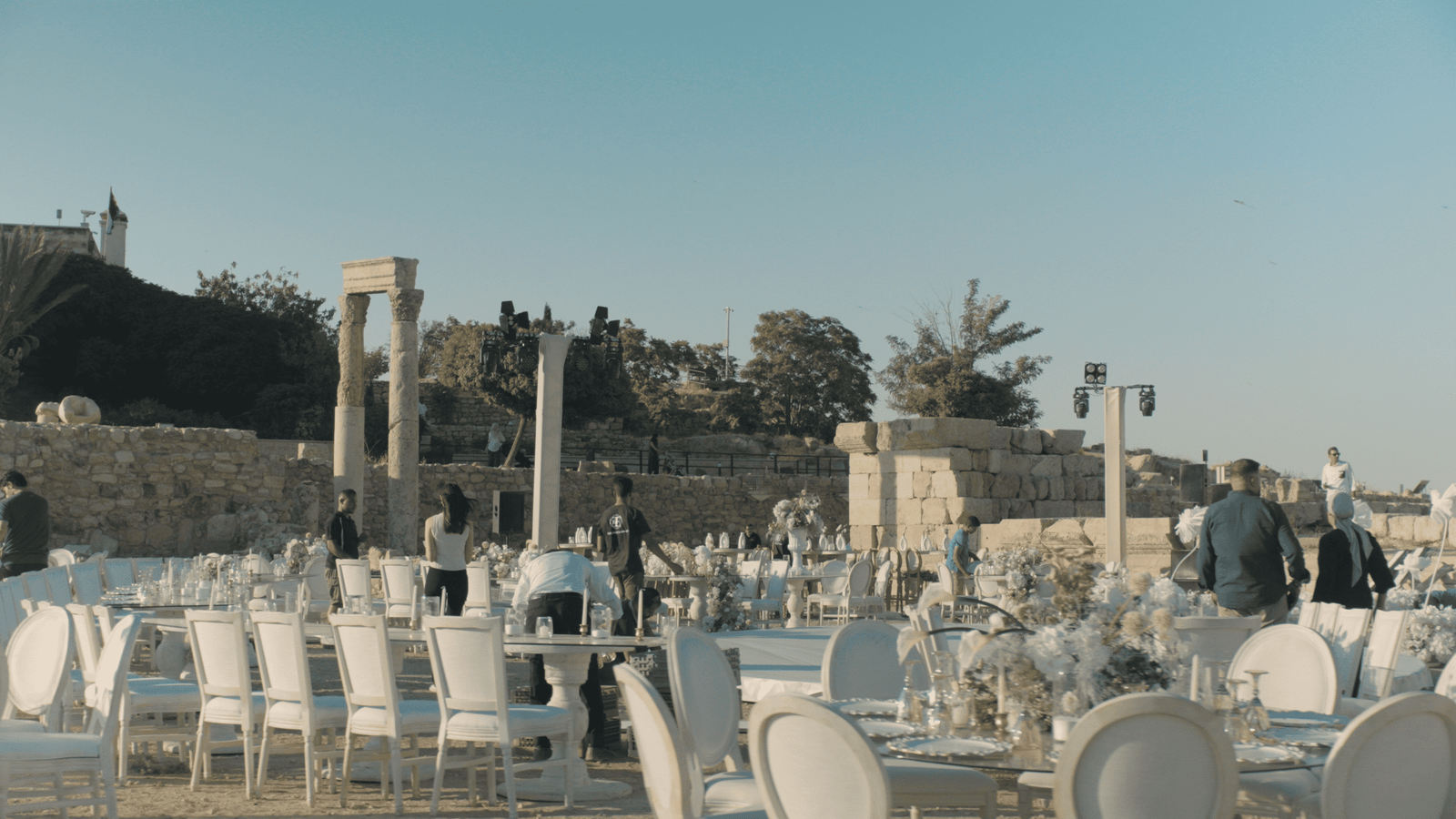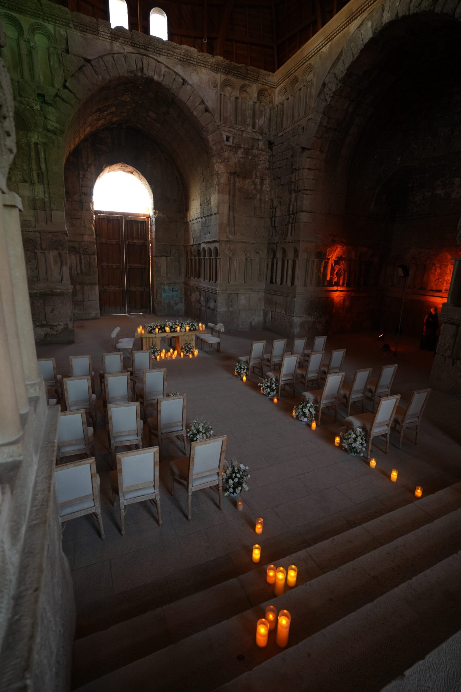 - Wardrobe: airy dresses, veils with movement, block heels or chic flats for stone and sand.