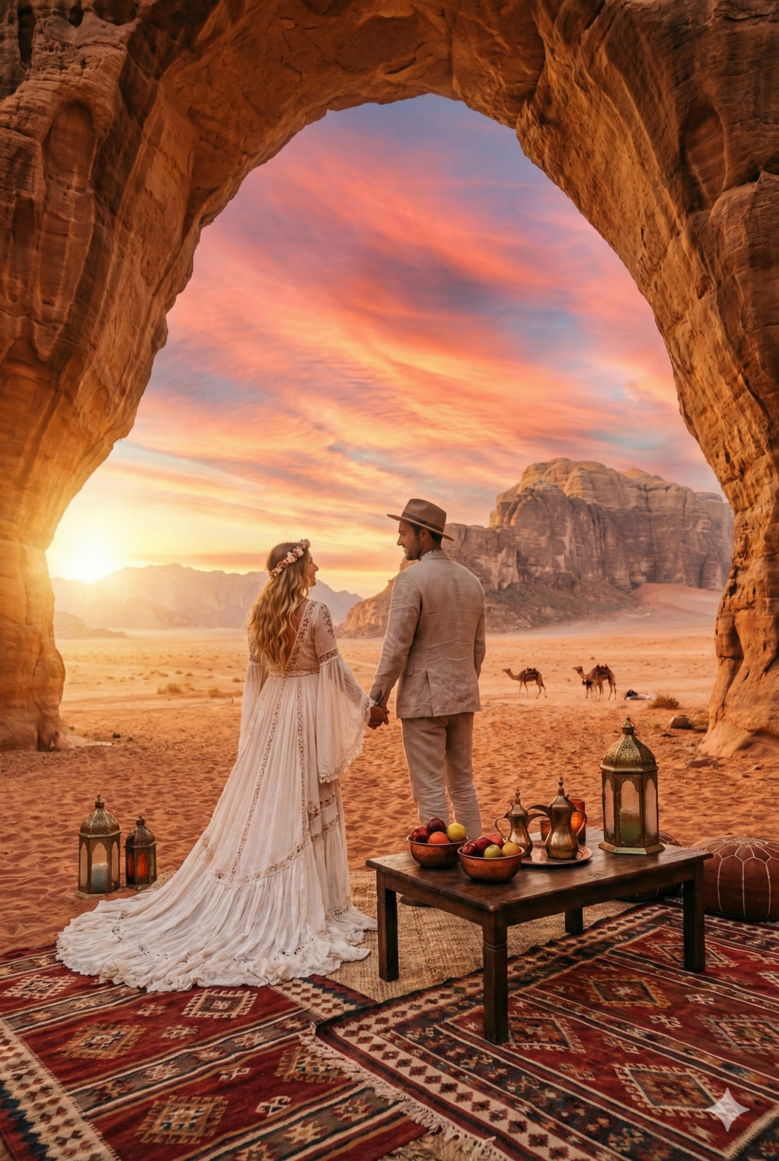 - Act II Ceremony & dinner. Petra at twilight or Wadi Rum under stars.